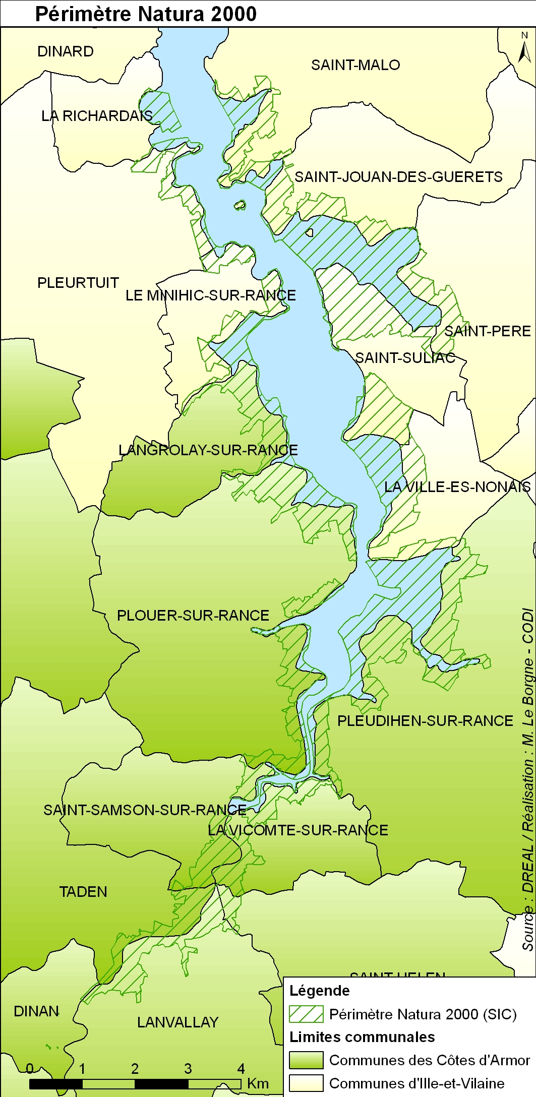 Le périmètre est quasiment calqué sur le périmètre du site classé. Il comprend le chenal de navigation au niveau de la Rance dite fluviale, c'est-à-dire en amont de l’écluse du Châtelier, mais pas au niveau de la Rance maritime. Le site est discontinu par endroits, excluant les zones les plus urbanisées.